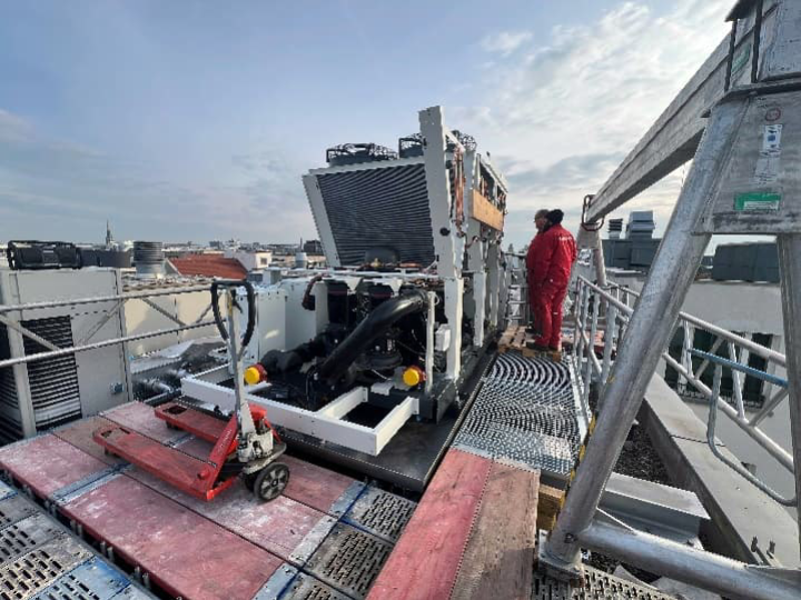 Eine besondere Herausforderung war die zerlegte Einbringung der Kältemaschine über einen Gerüstaufzug